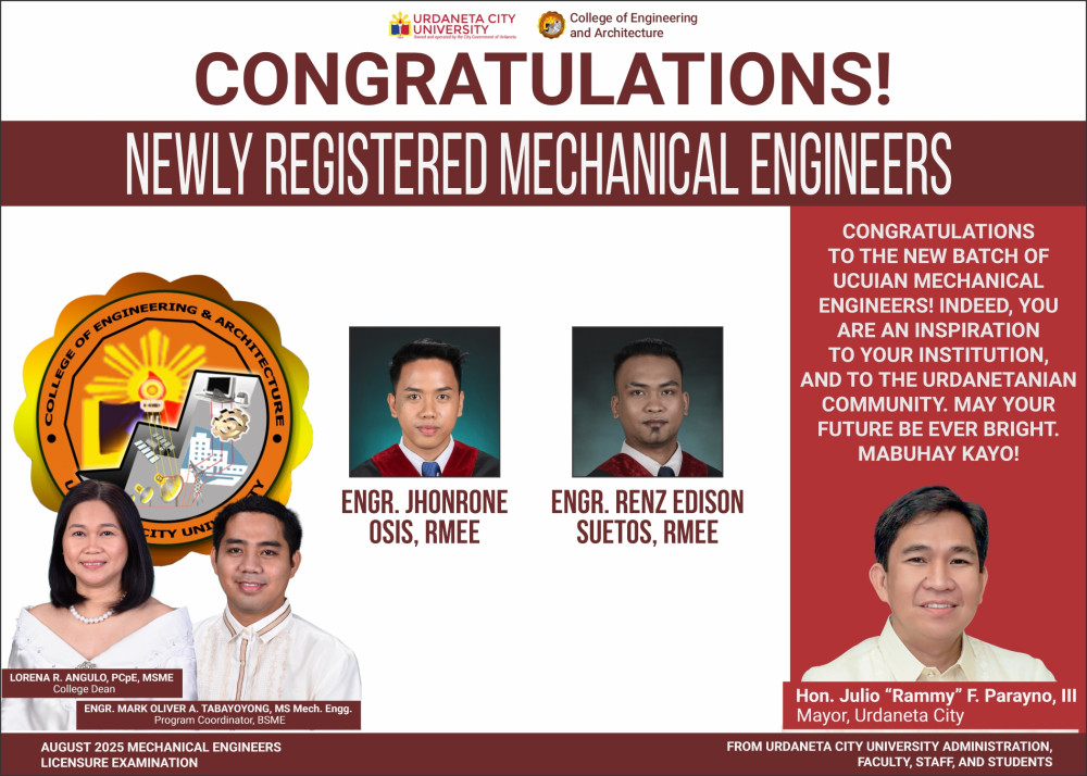 𝗨𝗿𝗱𝗮𝗻𝗲𝘁𝗮 𝗖𝗶𝘁𝘆 𝗨𝗻𝗶𝘃𝗲𝗿𝘀𝗶𝘁𝘆 celebrates the success of our new 𝗠𝗲𝗰𝗵𝗮𝗻𝗶𝗰𝗮𝗹 𝗘𝗻𝗴𝗶𝗻𝗲𝗲𝗿𝘀 for passing the 𝗔𝘂𝗴𝘂𝘀𝘁 𝟮𝟬𝟮𝟱 𝗠𝗲𝗰𝗵𝗮𝗻𝗶𝗰𝗮𝗹 𝗘𝗻𝗴𝗶𝗻𝗲𝗲𝗿 𝗟𝗶𝗰𝗲𝗻𝘀𝘂𝗿𝗲 𝗘𝘅𝗮𝗺𝗶𝗻𝗮𝘁𝗶𝗼𝗻.