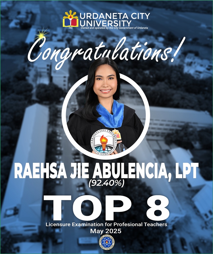 Urdaneta City University is once again beaming with pride and joy as we celebrate the success of our very own 𝗥𝗔𝗘𝗦𝗛𝗔 𝗝𝗜𝗘 𝗔𝗕𝗨𝗟𝗘𝗡𝗖𝗜𝗔, 𝗟𝗣𝗧, a graduate of the 𝘉𝘢𝘤𝘩𝘦𝘭𝘰𝘳 𝘰𝘧 𝘊𝘶𝘭𝘵𝘶𝘳𝘦 𝘢𝘯𝘥 𝘈𝘳𝘵𝘴 𝘌𝘥𝘶𝘤𝘢𝘵𝘪𝘰𝘯 (𝘉𝘊𝘈𝘌𝘥) program, who earned the 𝟴𝘁𝗵 𝘀𝗽𝗼𝘁 𝗻𝗮𝘁𝗶𝗼𝗻𝘄𝗶𝗱𝗲 in the 𝘔𝘢𝘳𝘤𝘩 2025 𝘓𝘪𝘤𝘦𝘯𝘴𝘶𝘳𝘦 𝘌𝘹𝘢𝘮𝘪𝘯𝘢𝘵𝘪𝘰𝘯 𝘧𝘰𝘳 𝘗𝘳𝘰𝘧𝘦𝘴𝘴𝘪𝘰𝘯𝘢𝘭 𝘛𝘦𝘢𝘤𝘩𝘦𝘳𝘴 with an impressive 𝗮𝘃𝗲𝗿𝗮𝗴𝗲 𝗼𝗳 𝟵𝟮.𝟰𝟬%.