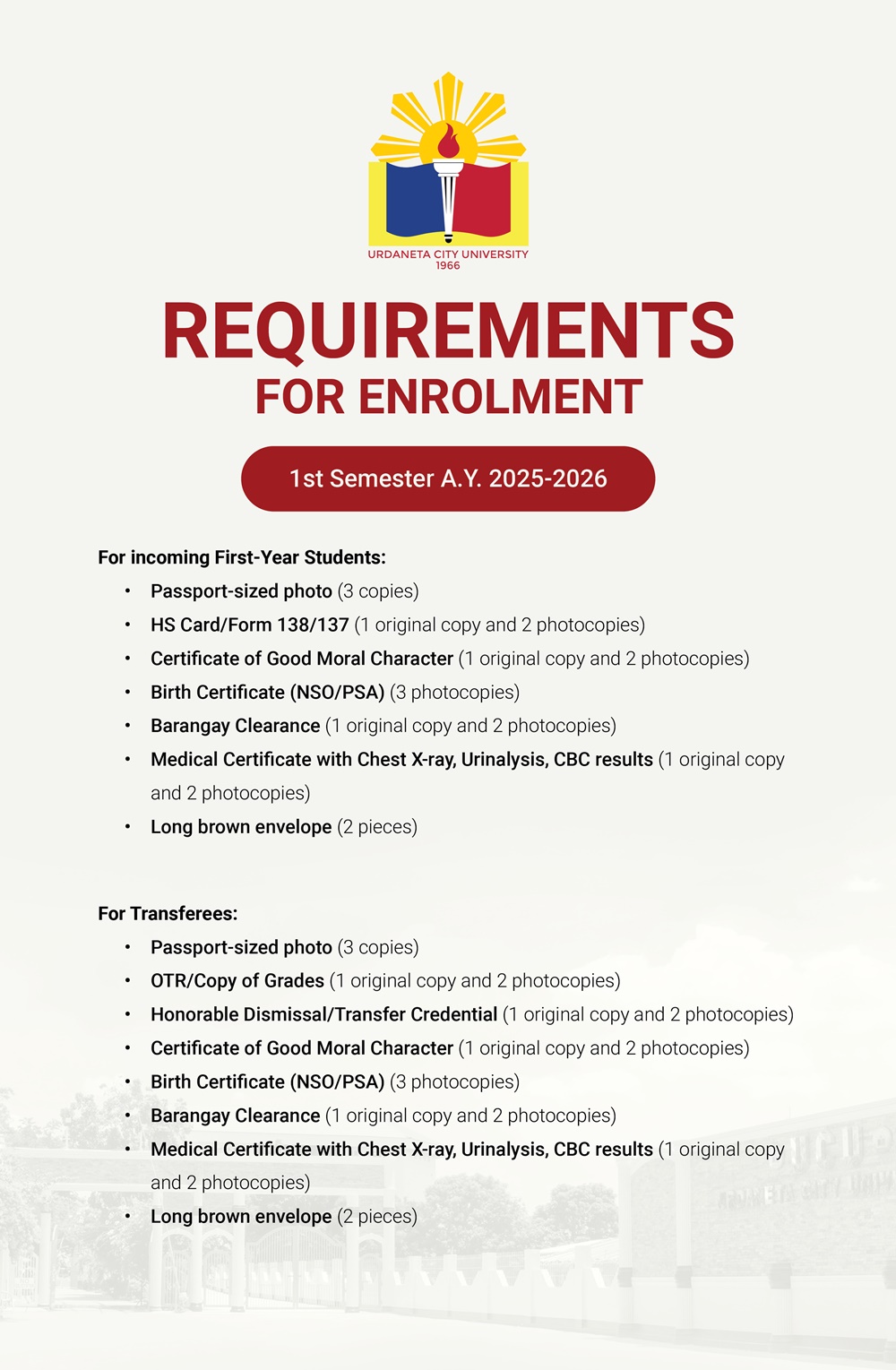 You are advised to visit the area of Psychological Assessment and Counseling Center (UCU-PACC) at the University Gymnasium from July 1 to 5, 2025 to choose from programs that are still open for admission. Kindly ensure you have the following documents ready: