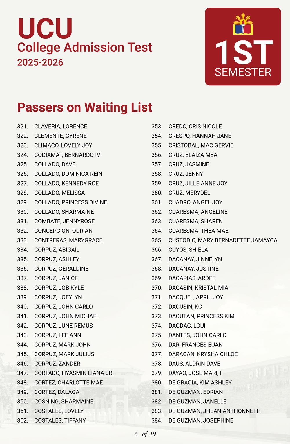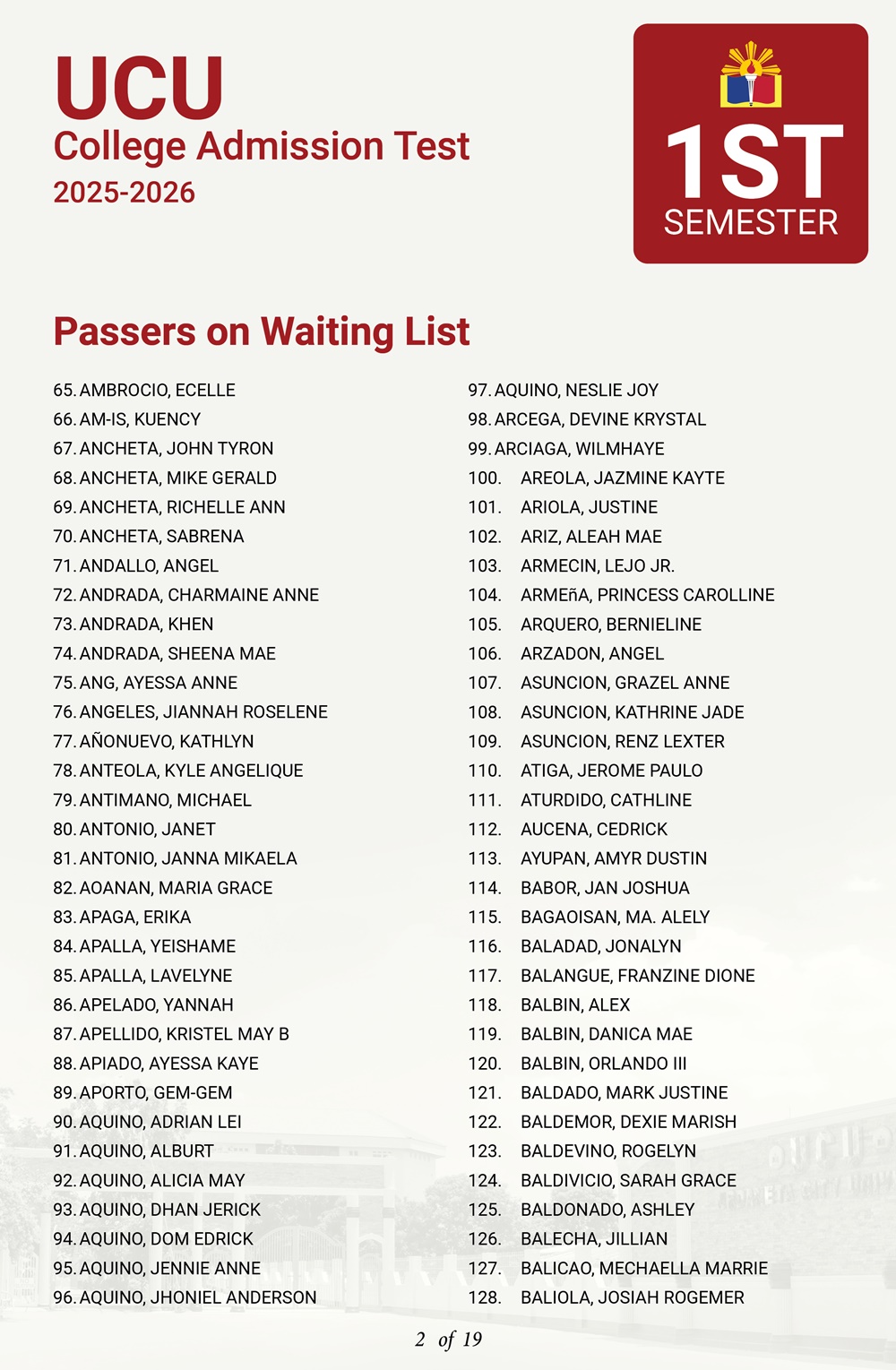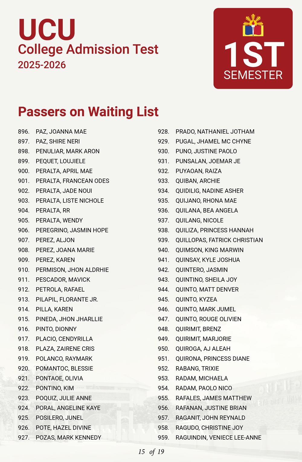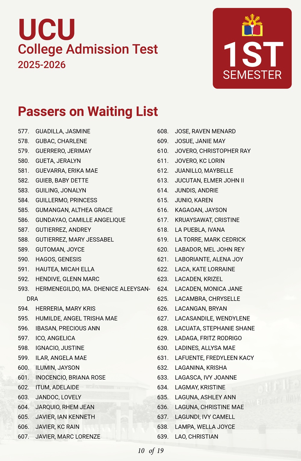 ATTENTION: UCU-CAT examinees for the First Semester, A.Y. 2025–2026 𝘸𝘩𝘰 𝘸𝘦𝘳𝘦 𝘯𝘰𝘵 𝘪𝘯𝘤𝘭𝘶𝘥𝘦𝘥 𝘪𝘯 𝘵𝘩𝘦 𝘧𝘪𝘳𝘴𝘵 𝘢𝘯𝘥 𝘴𝘦𝘤𝘰𝘯𝘥 𝘣𝘢𝘵𝘤𝘩 𝘰𝘧 𝘱𝘢𝘴𝘴𝘦𝘳𝘴— 𝘁𝗵𝗲 𝗪𝗔𝗜𝗧𝗜𝗡𝗚 𝗟𝗜𝗦𝗧 𝗳𝗼𝗿 𝗾𝘂𝗮𝗹𝗶𝗳𝗶𝗲𝗱 𝗮𝗽𝗽𝗹𝗶𝗰𝗮𝗻𝘁𝘀 𝗶𝘀 𝗻𝗼𝘄 𝗮𝘃𝗮𝗶𝗹𝗮𝗯𝗹𝗲.